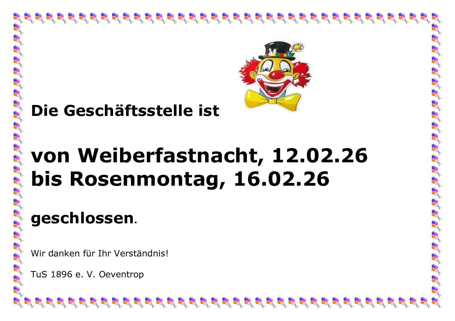 Die Geschäftsstelle ist sowohl an Weiberfastnacht, 12.02.2026 , als auch Rosenmontag, 16.02.2026, geschlossen. Wir wünschen allen fröhliche Karnevalstage.