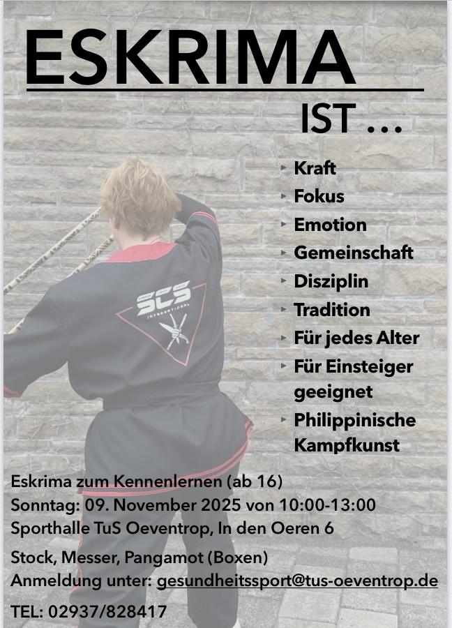Wir werden ab Januar einen neuen Kurs „ESKRIMA“ anbieten. Dieser Kurs wird montags von 18:00 – 19:30 Uhr stattfinden. Die Übungsleiterin ist Elke Balkenohl. Interessierte können ESKRIMA am Sonntag, 09.11.2025 …