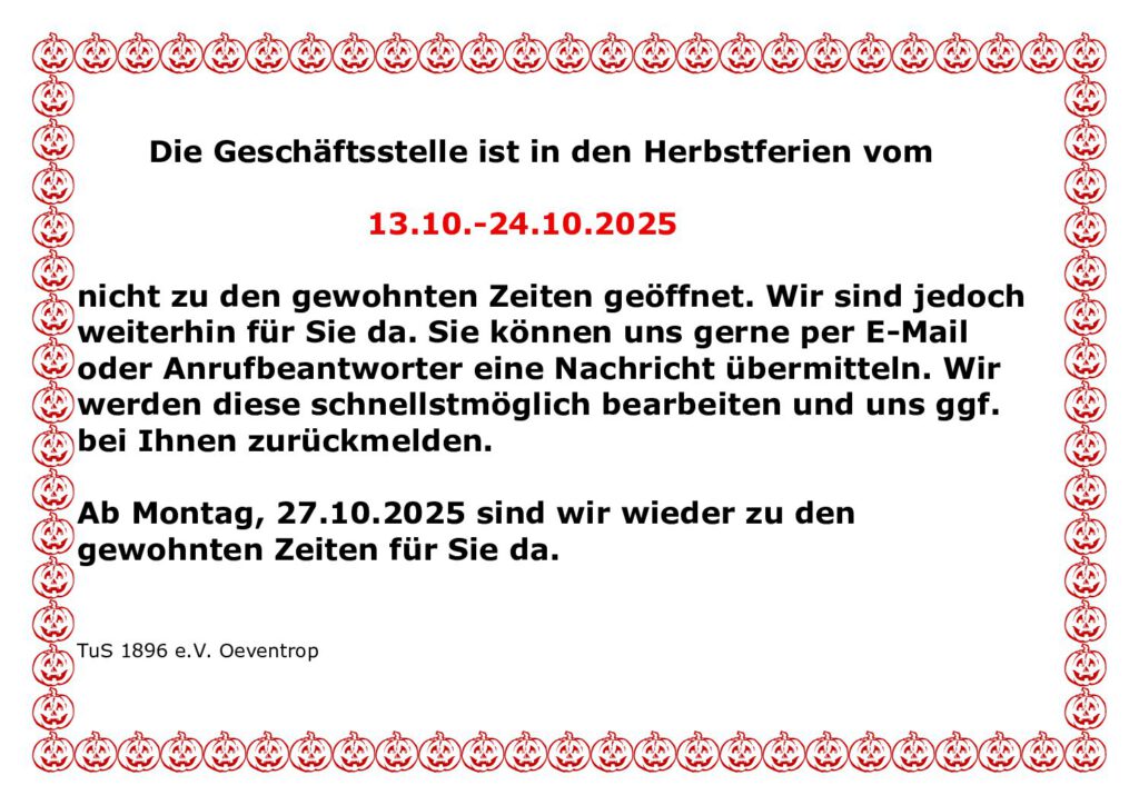 Die Geschäftsstelle ist in den Herbstferien vom 13.10.-24.10.2025 nicht zu den gewohnten Zeiten geöffnet. Wir sind jedoch weiterhin für Sie da. Sie können uns gerne per E-Mail oder Anrufbeantworter …
