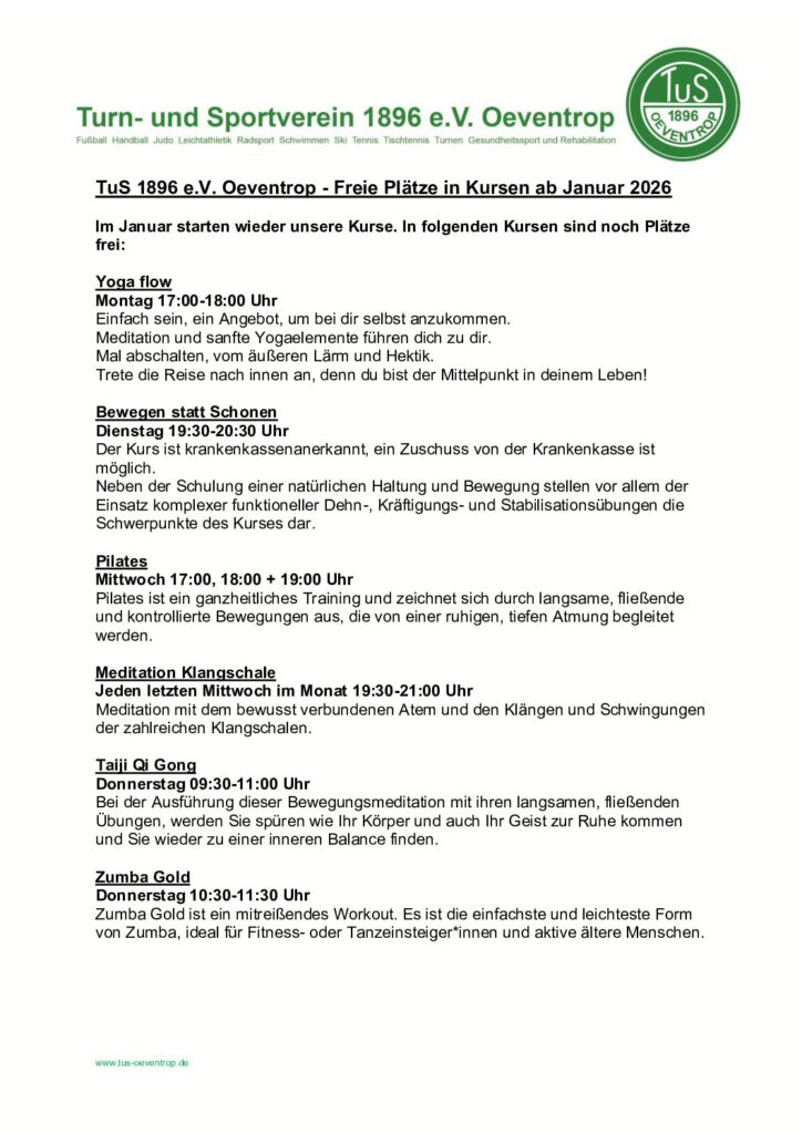 TuS 1896 e.V. Oeventrop – Freie Plätze in Kursen ab Januar 2026 Im Januar starten wieder unsere Kurse. In folgenden Kursen sind noch Plätze frei: Yoga flow Montag 17:00-18:00 Uhr …
